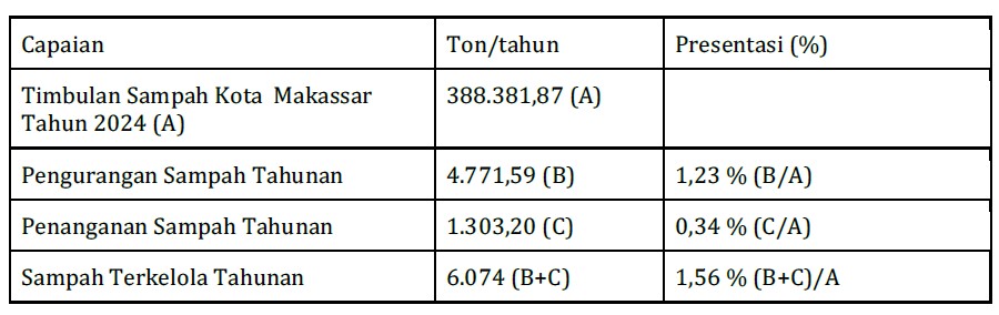 Data Sistem Pengelolaan Sampah Nasional (SIPSN) tahun 2024 menunjukkan fakta mencengangkan: dari total 388.381 ton timbulan sampah tahunan di Makassar, hanya 1,56% yang berhasil dikelola. Angka ini sangat jauh dari target nasional untuk mencapai 100% sampah terkelola pada tahun 2029. Selain itu, produksi sampah per kapita masyarakat Makassar kini mencapai hampir 1 kg per orang per hari, dua kali lipat dari rata-rata nasional.