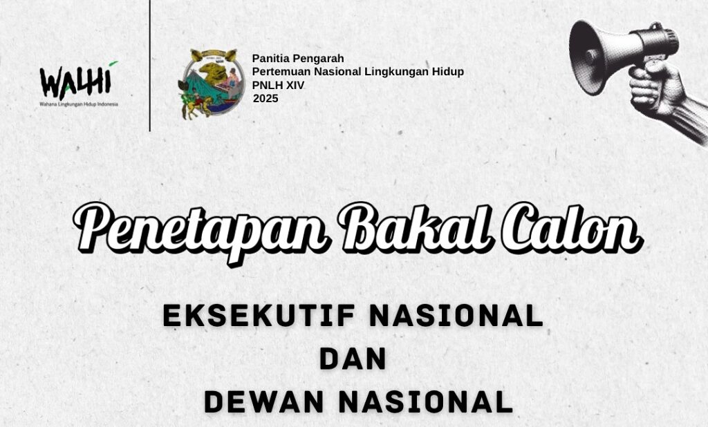 Setelah melalui proses yang ketat selama sepekan, Panitia Pengarah PNLH XIV WALHI menetapkan 4 bakal calon untuk posisi Direktur Eksekutif Nasional dan 7 bakal calon untuk posisi Dewan Nasional WALHI periode 2025–2029. Seluruh bakal calon adalah kader gerakan yang telah mengabdi dalam perjuangan lingkungan hidup dan keadilan ekologis selama paling sedikit lima tahun, baik melalui kerja-kerja di WALHI langsung maupun melalui lembaga-lembaga anggotanya.